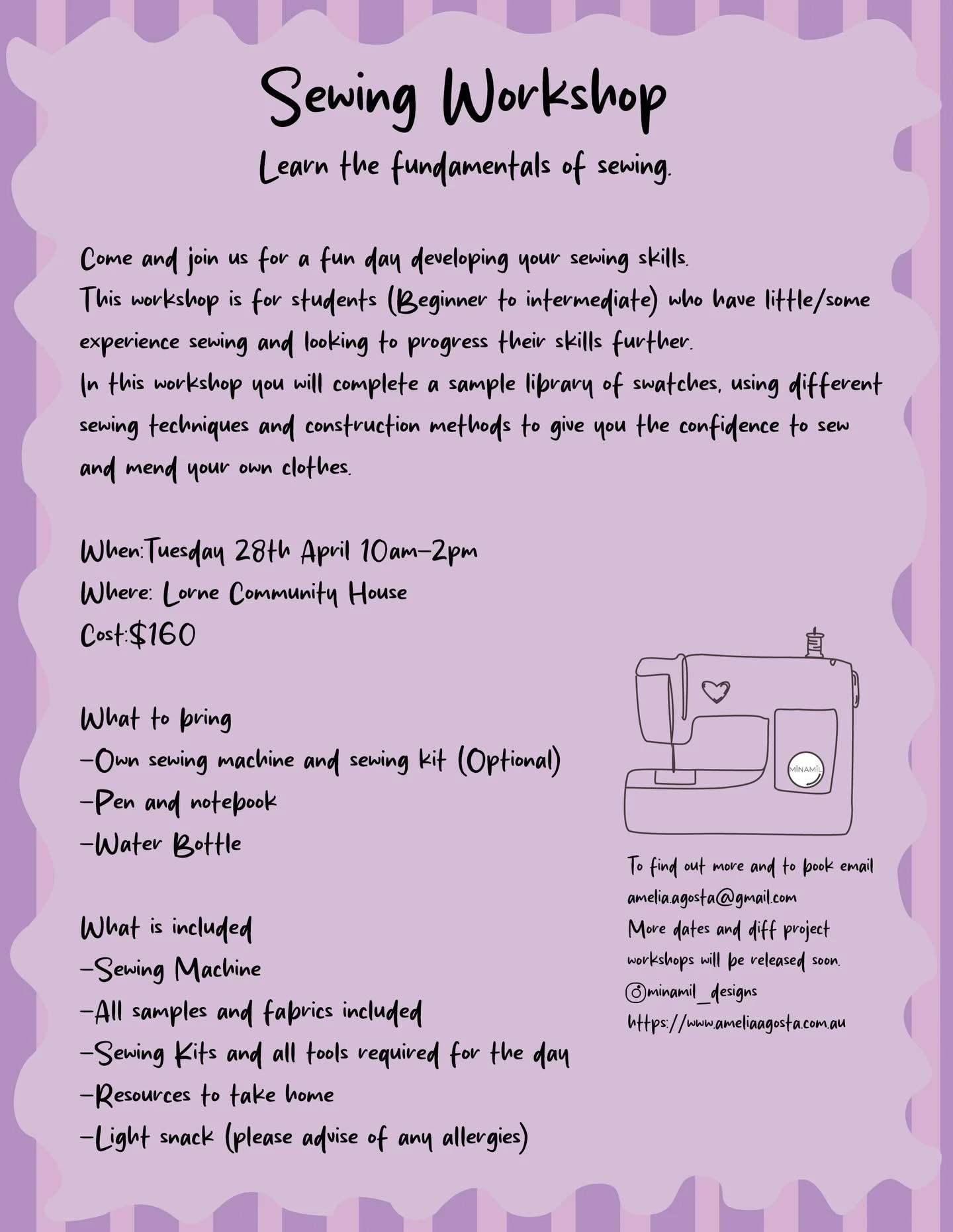Amelia loves sharing her skills and knowledge with those that are passionate and eager to learn the fundamentals of Design and Sewing. Her Sewing classes and workshops allow you to explore your creative ability. Classes are held within a relaxed and friendly environment, tailored to each individual’s skill level.